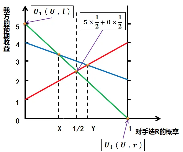 当对手选R的概率大于X小于Y,则D是最佳应对。