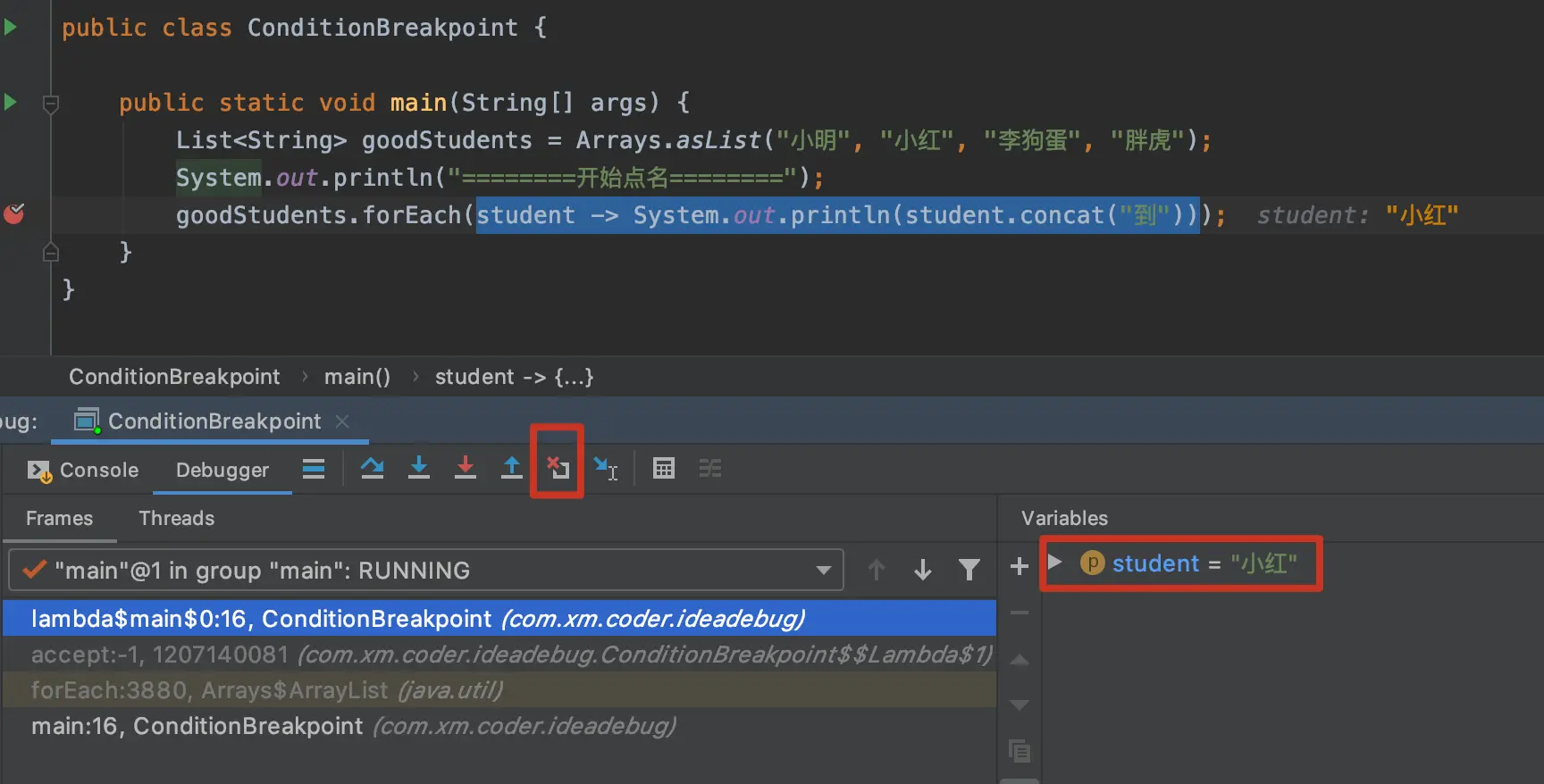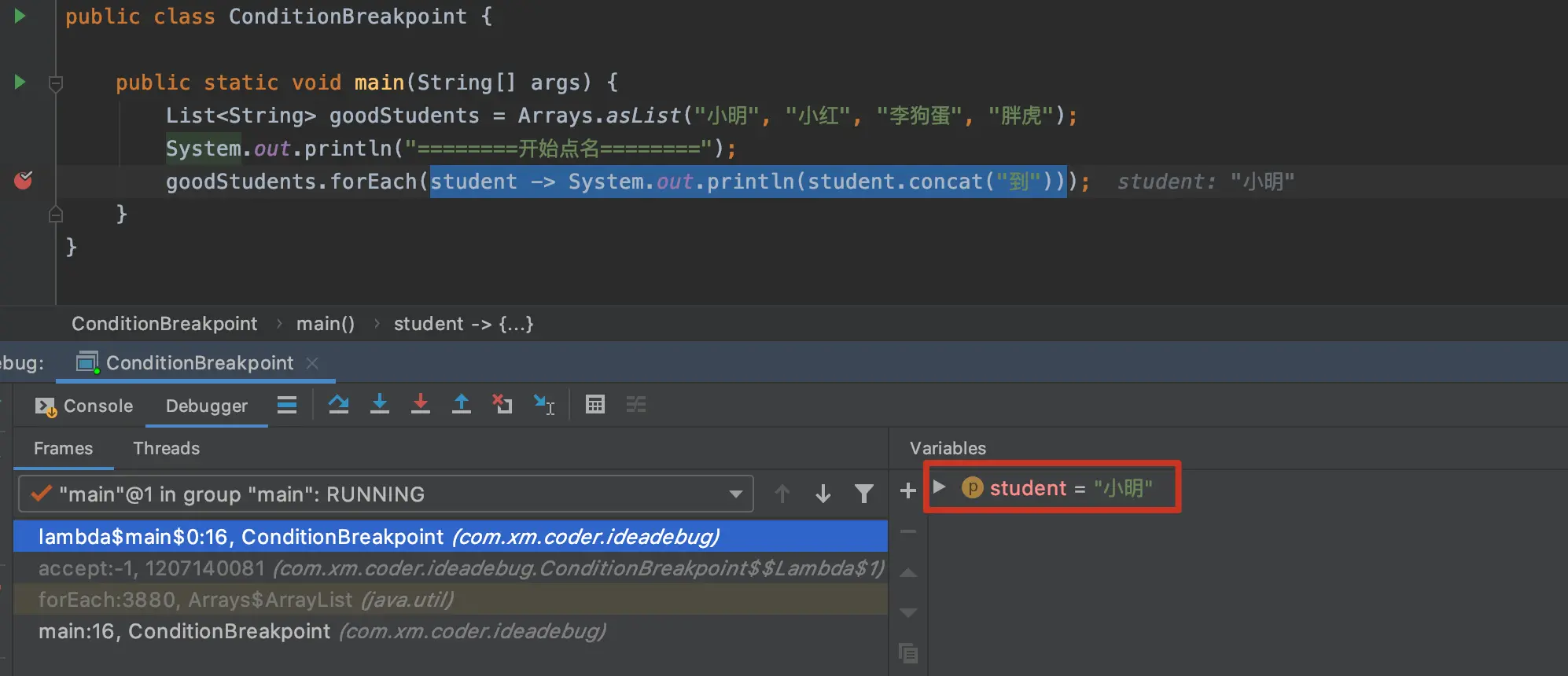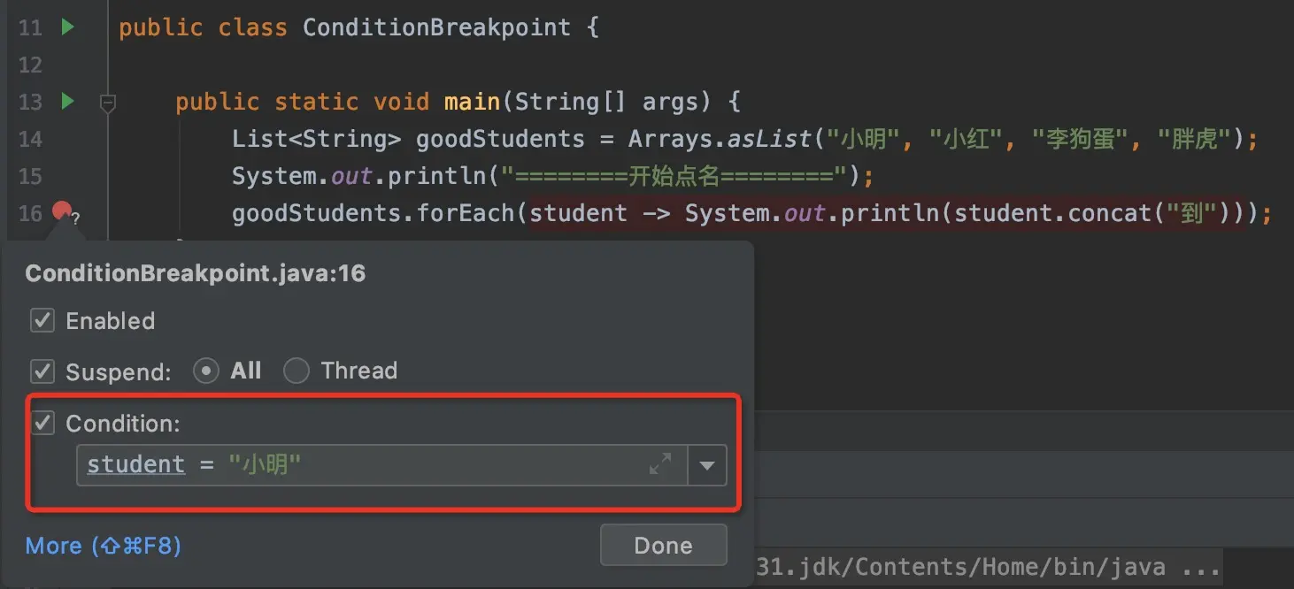 右击断点旁边的小红点(断点),弹出面板,在Condition这里填入暂停条件,这样调试时,当程序满足条件时就会稳稳地停在student= "小明"的位置。