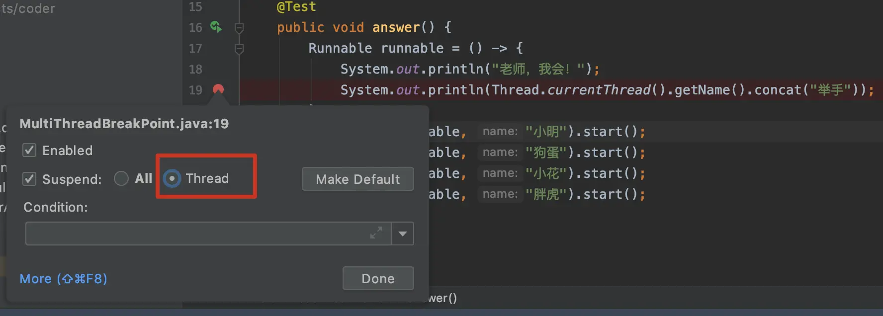这么多同学抢答,让坚守岗位30多年的沐芳老师觉得再这样下去课堂可能会有点混乱:但这并难不倒从业30多年的沐芳老师,她按如下图所示:在断点的位置上右击,选择Thread,就可以有目的地跟踪某一位同学的抢答情况(一切都在掌握之中)。
