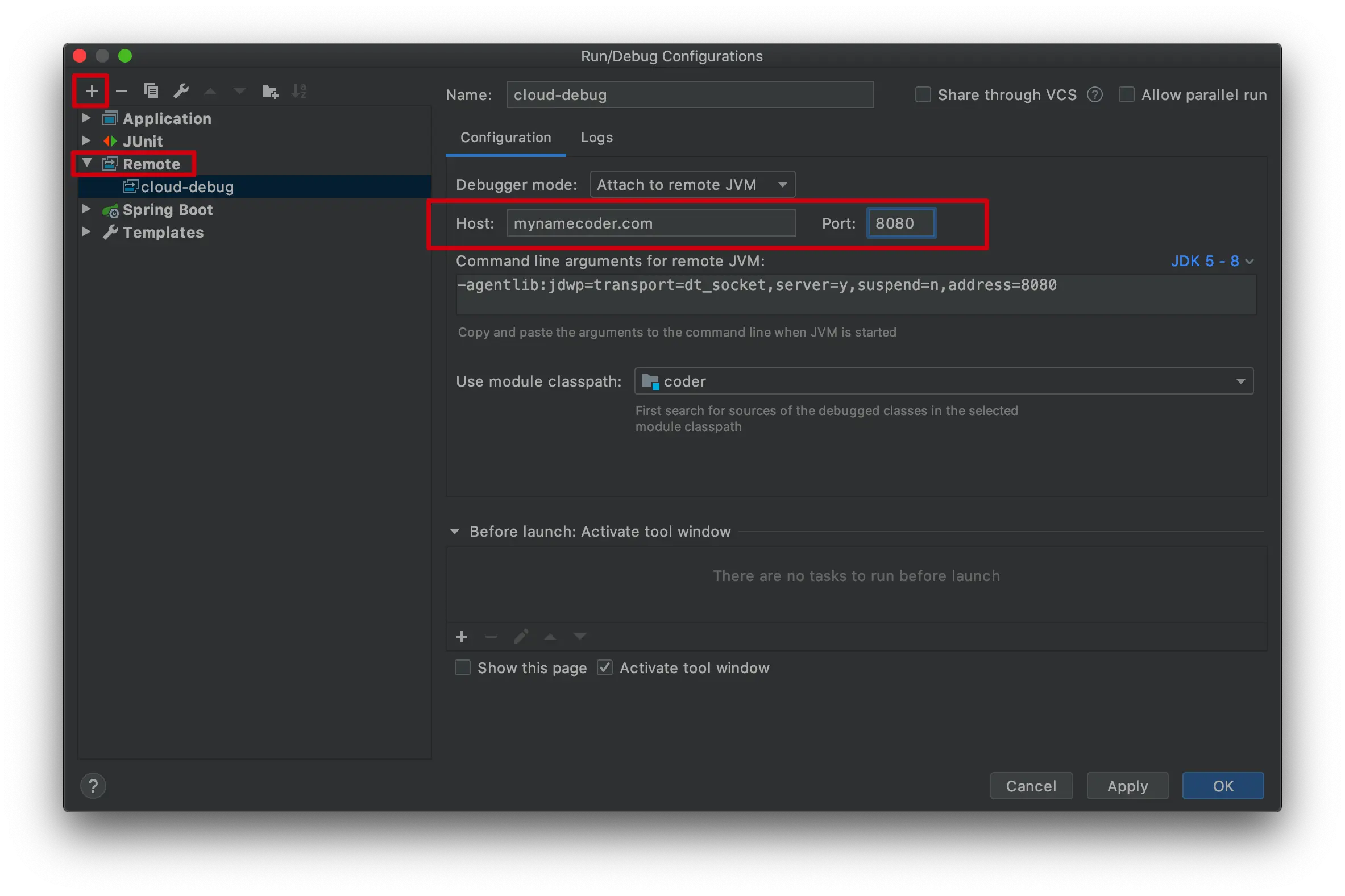 大家能看到这里,小明不得不给大家介绍一个装X的技能:云调试。即本机不用启动项目,只要本机的源代码与远程服务器运行的jar包匹配,就可以在本机直接远程调试服务器上的代码!打开姿势如下: