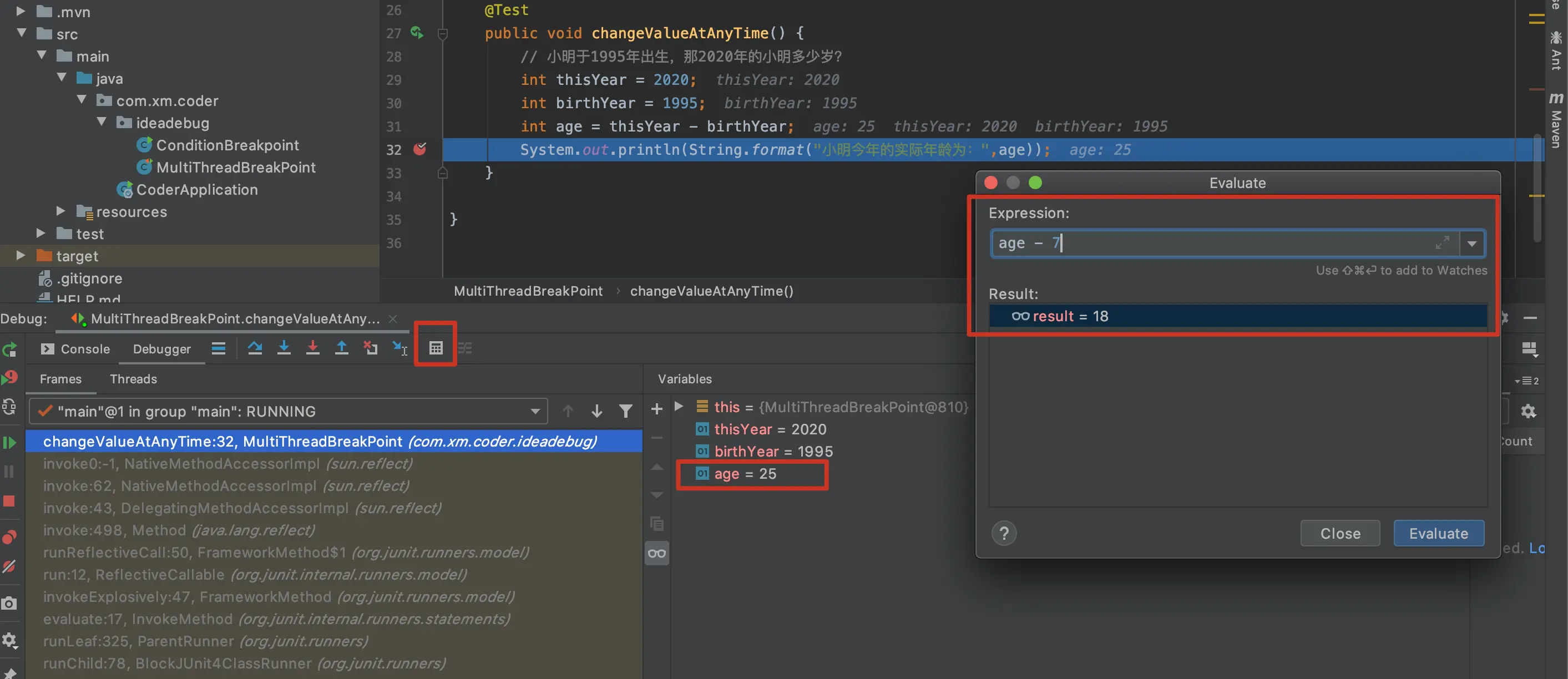 再一个就是调试时,我们还可以临时执行一些表达式,点击红色框框选中的图标,然后输入你想执行的表达式,如下所示: