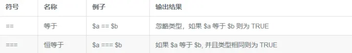 注意: === 运算符‘类型比较相对安全’, 仅当两个值具有相同的类型和值时才会返回 TRUE, 使用 == 时,值相等就会返回 TRUE。