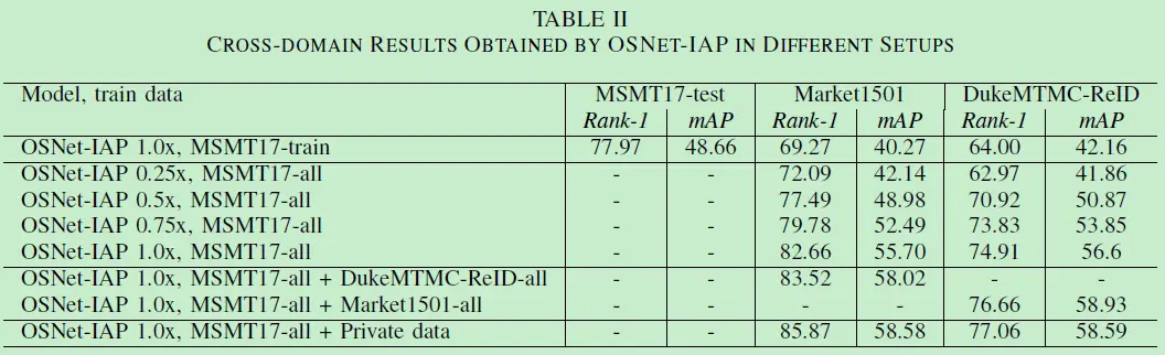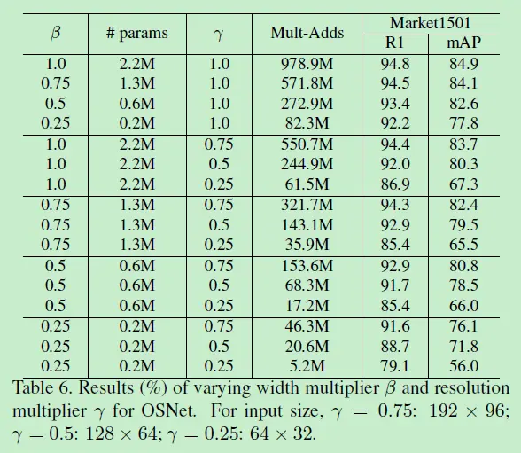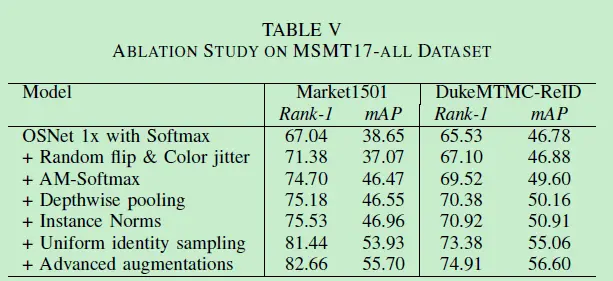 实验用了很多的数据增强方法如随机颜色转换(在HSV空间中抖动,转换为灰度),空间变形(随机旋转,水平翻转,填充)和图像失真(随机图形和网格的随机擦除图)。另外OSNet在ImageNet上预训练过。因为实验主要是在MSMT17上训练后再迁移到其他target domain,为了防止过拟合,文章在每个conv block后面使用了Gaussian Continuous Dropout layers。OSNet有一个手动调整的超参数,宽度乘数β,