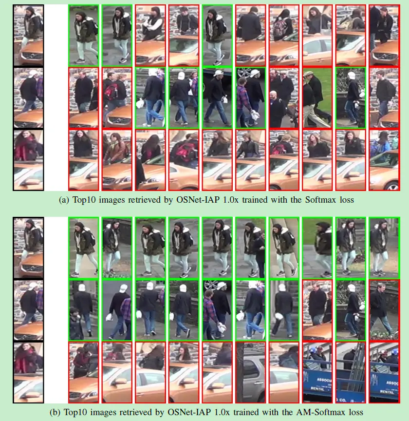 实验可视化top10的检索结果如下,target domain为DukeMTMC-ReID,模型在MSMT-all上训练过,绿框框为正确的结果,红框框为错误的结果,总体来说AM-softmax正确数要更多: