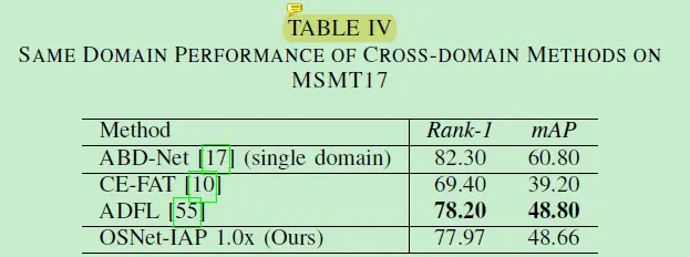 没有单域实验的结果,有单域的实验结果(MSMT17)也·比较一般,没有SOTA,也不够competitive,原版OSNet在MSMT17测的rank-1有78.7,文章测的OSNet-IAP 1.0x还掉到77.97,很难说没有问题。cross domain ReID应该在保证single domain识别率的基础上再cross domain,不然本末倒置。