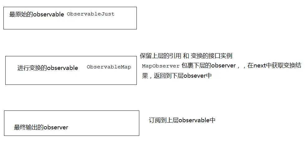 中间部分,拿到上层的observable进行包装,拿到下层的observer进行包装,获取变换结果传递到下层。