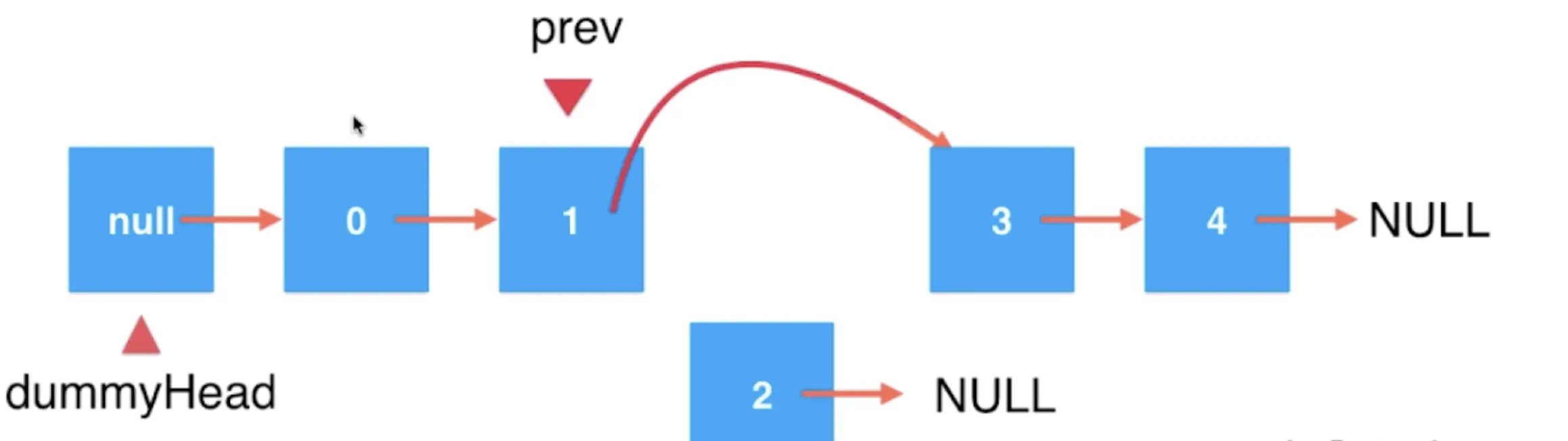 cur.next = delN.next // 将删除元素的前一个元素的next绕过删除的元素指向删除元素的next