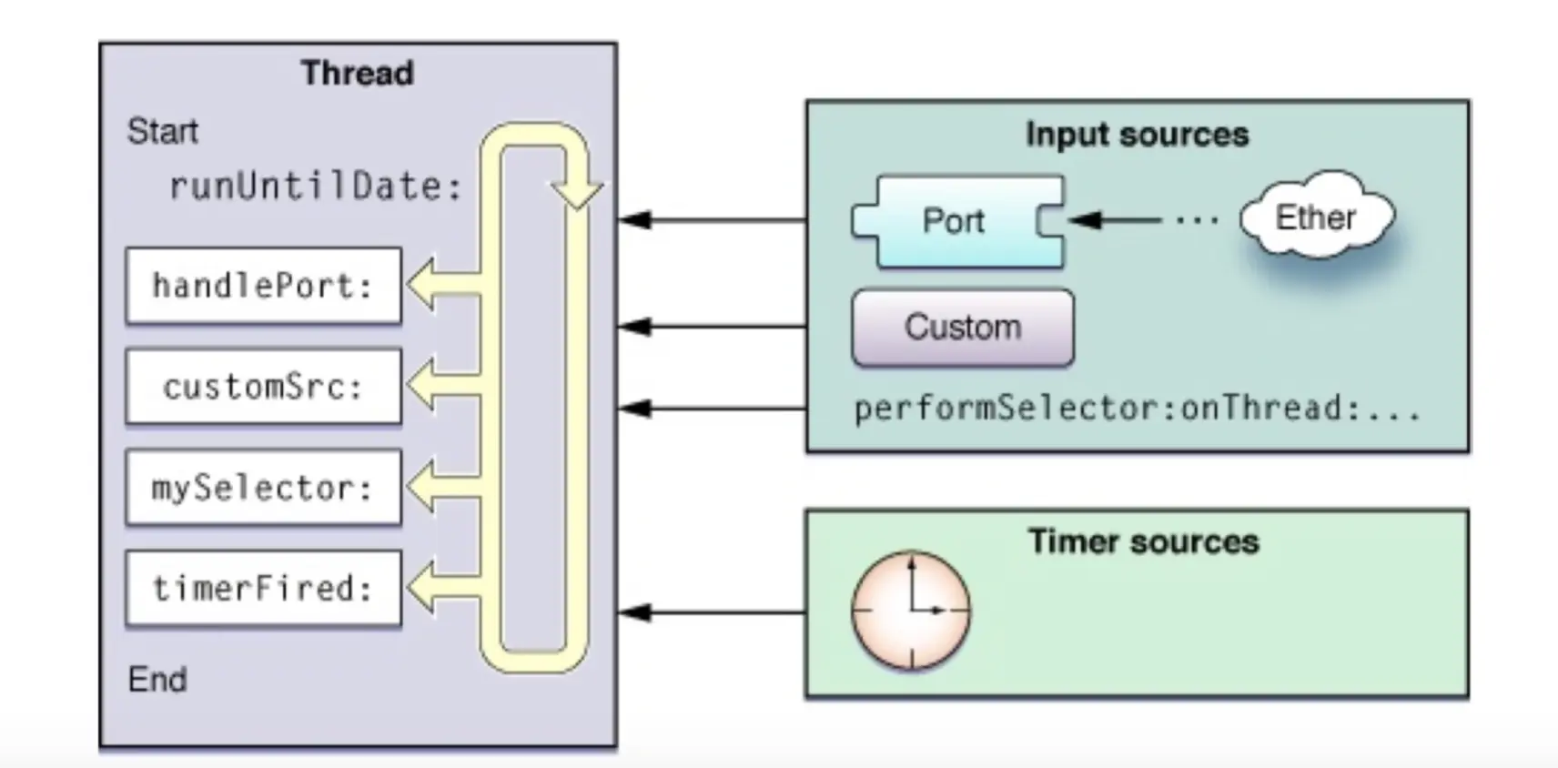 上面是timers的运行方式,还有__CFRunLoopDoBlocks、__CFRunLoopDoSource1、__CFRunLoopDoObservers、__CFRunLoopDoSources0均类似。