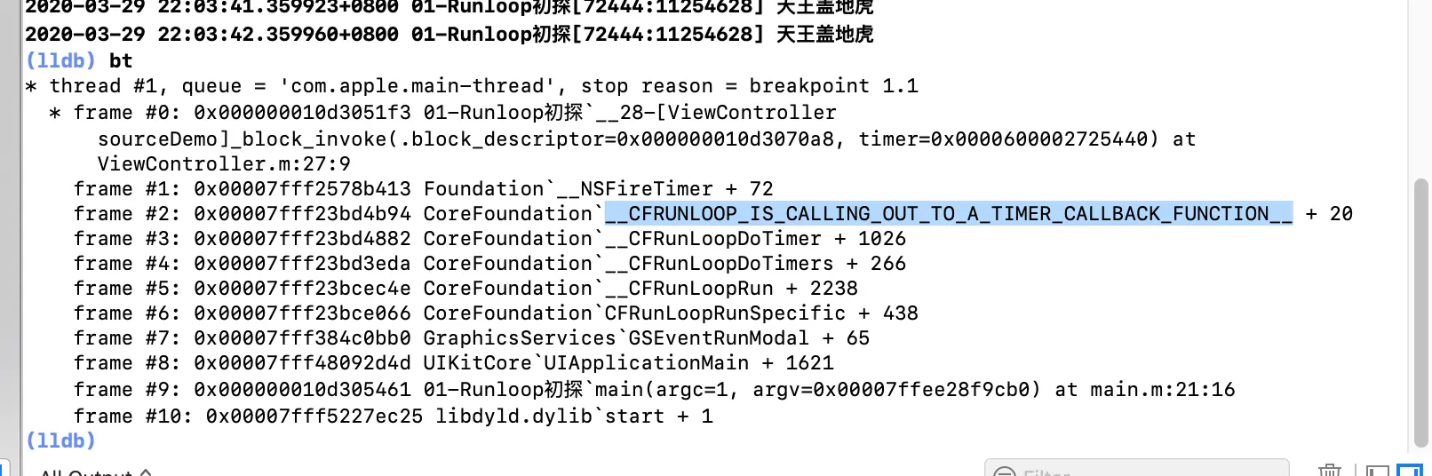 从堆栈信息里面我们看到调用了__CFRunLoopRun-->__CFRunLoopDoTimers-->__CFRunLoopDoTimer,__CFRunLoopRun是唤醒runloop。我们再看一下__CFRunLoopDoTimers