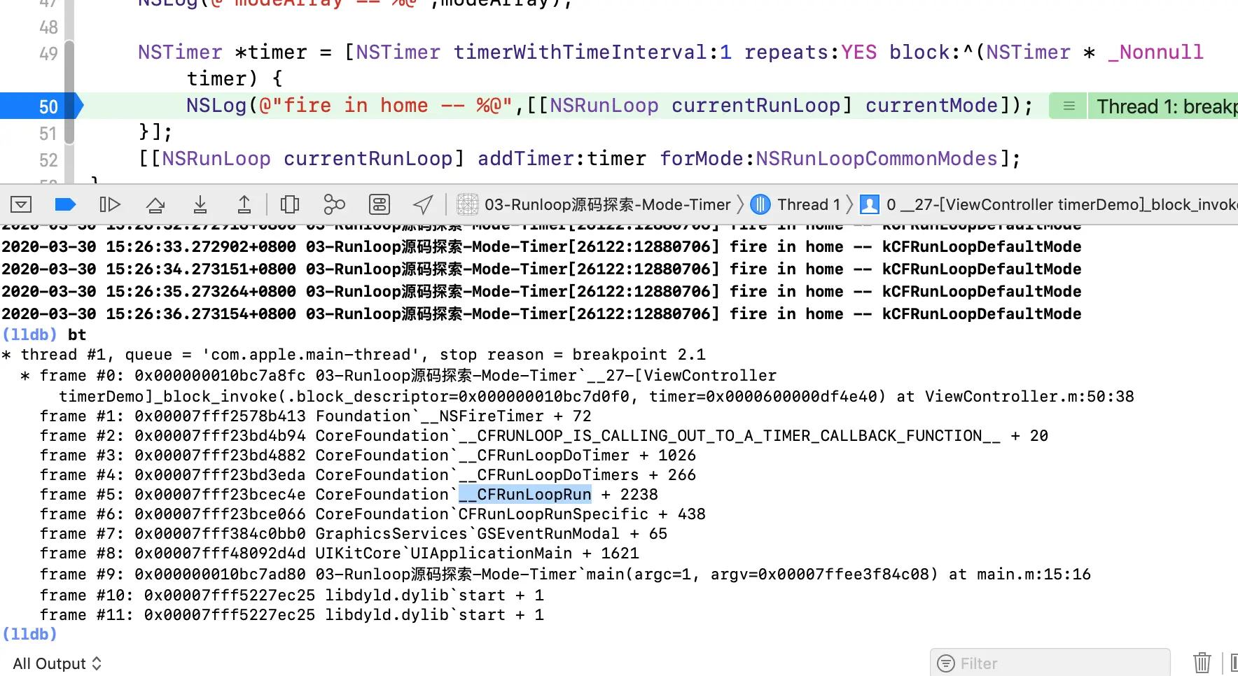 NSLog(@"fire in home -- %@",[[NSRunLoop currentRunLoop] currentMode]);