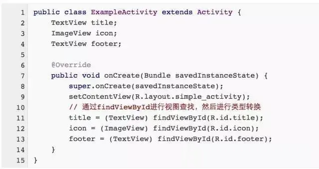 在ExampleActivity函数的onCreate函数中,我们通常会对各个子视图进行初始化,这些代码看起来重复性很高,而且丑陋不堪,几乎都要对View进行强转,当一个布局中含有十个以上的View时,再加上为某些View添加上事件处理等,这部分的代码将占用很大的篇幅。