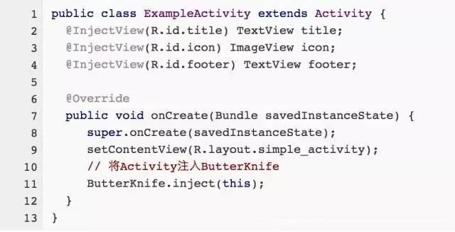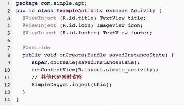 例如将上述ExampleActivity的示例替换成小民的SimpleDagger,使用ViewInject注解标识中三个View,代码如下 :