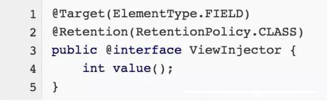 因为我们的这个注解只支持View的id注入,因此它的目标元素是字段,它只存在在class文件中,因为一旦过了编译期我们就不再需要它了。关于注解方面的基础知识我们不做过多讲解,对这方面不了解的同学可以先阅读相关书籍,例如《Java编程思想》、《Java核心技术》。