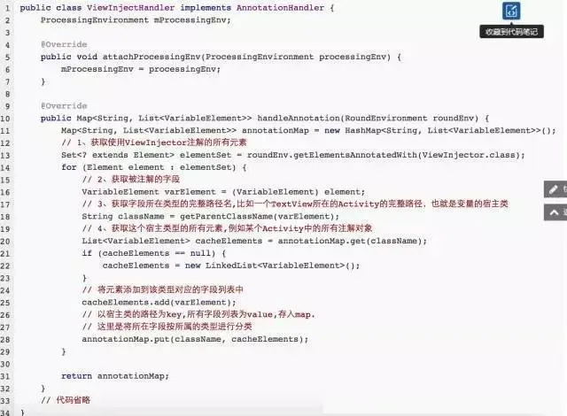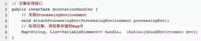 该接口声明了两个函数,一个是关联ProcessingEnvironment,另一个是handleAnnotation函数,负责处理标识了ViewInjector注解的元素。小民的设计思路是定义一个AnnotationHandler接口,每个实现类处理一种类型的注解,例如ViewInjectHandler只处理ViewInject注解。下面我们看看ViewInjectHandler的核心代码 :