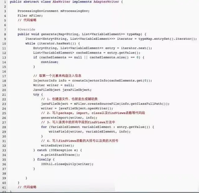 - 此时执行到process函数的最后一步,这里调用了AdapterWriter来生成辅助类,这个辅助类要生成的代码素材就是我们上述的VariableElement元素列表,调用的是AdapterWriter的generate函数,在AdapterWriter之下我们还建立了一个AbsWriter来封装一些通用逻辑,AbsWriter核心代码如下 :