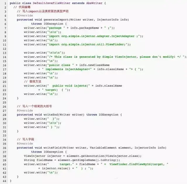 在AbsWriter的generate函数中,我们定义了一个生成辅助类的逻辑骨架,分别为获取宿主类型的所有元素,并且通过第一个元素获取宿主类所在的包以及构建辅助类的类名等,然后创建一个新的java类,最后分别写入import、所有被注解的元素等信息写入到辅助类当中,所有生成的辅助类都是InjectAdapter的子类。实现代码如下的功能在DefaultJavaFileWriter类中,核心代码如下 :