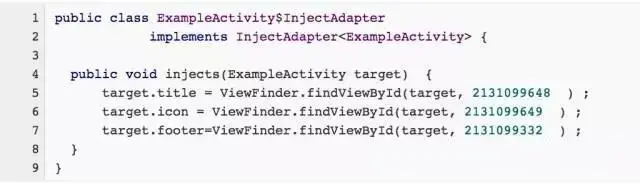 拿到完整类名之后再反射构建一个对象,然后转换为InjectAdapter,最后调用inject函数。而这个生成的ExampleActivity$InjectAdapter的inject函数中又对每个View进行了findViewBydId,也就是对它们进行了初始化。至此,这些View字段就被自动初始化了!