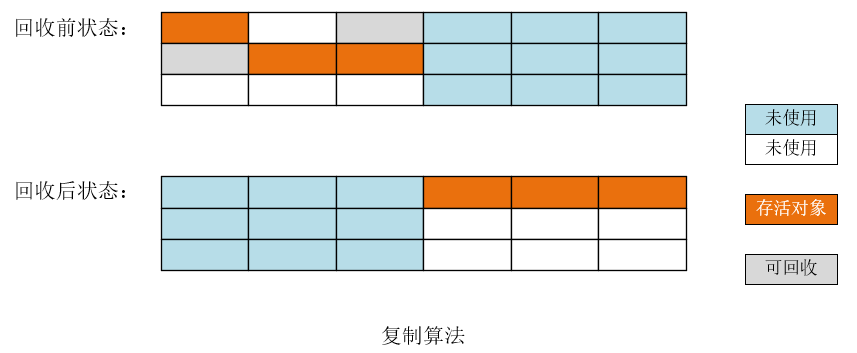为了解决标记-清除算法带来的内存碎片的问题,于是提出了复制算法。复制算法把内存空间划分为大小相等的两块,每次只使用其中的一块,然后再把另一块内存空间清理掉: