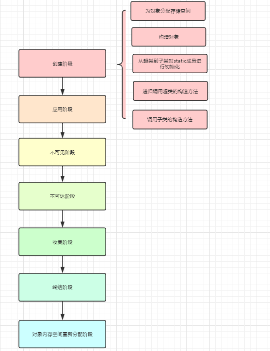如上图,对象的生命周期的 7 个阶段分别为:创建阶段、应用阶段、不可见阶段、不可达阶段、收集阶段、终结阶段、以及对象内存空间重新分配阶段。