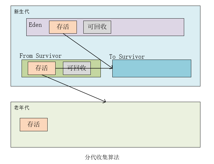 分代收集算法会结合不同的多种垃圾算法来处理不同的空间,因此在学习分代收集算法之前首先需要了解 Java 堆的空间划分。Java 堆被划分为新生代(Young Generation)和老年代(Tenured Generation),而新生代又被细分为 Eden 空间、From Survivor 空间和 To Survivor 空间。因为在 Java 堆里面,大部分对象都是"朝生夕灭",只有少数的对象的生命周期比较长,甚至有的对象的生命周期和虚拟机的生命周期一样长,对不同对象地生命周期采用不同的垃圾收集算法,这就是分代收集的概念。