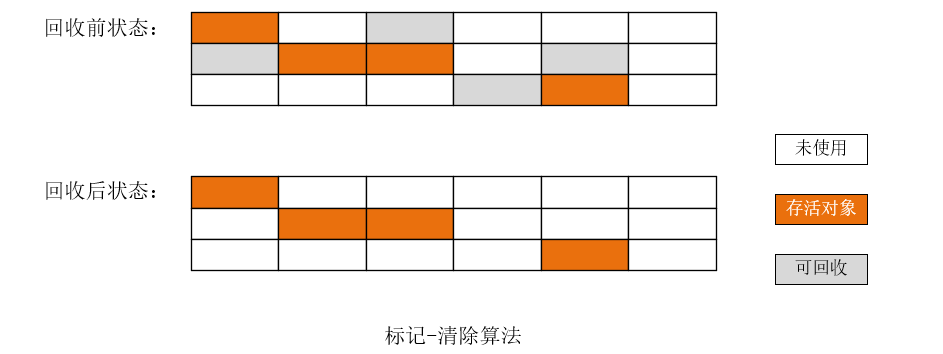 标记-清除算法主要有两个缺点:一是标记和清除的效率都不高;二是如上图所示,在标记清除可回收的对象空间后,会产生大量不连续的内存碎片,碎片太多可能会导致后续没有足够的内存分配给较大的对象,从而导致触发新一轮的垃圾收集动作。