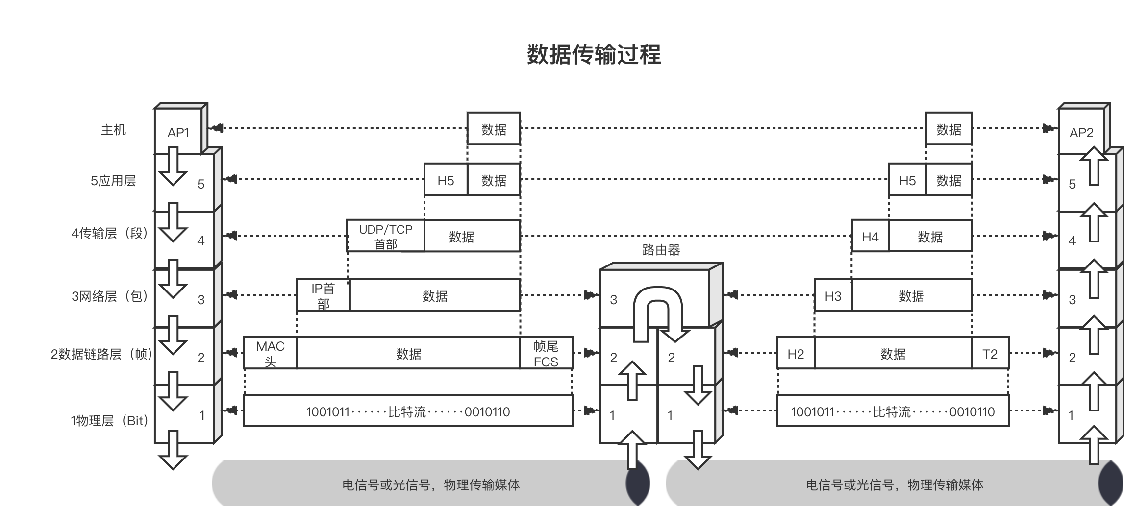 - 其次梳理体系结构,下图是数据传输过程。计算机网络是和现实世界结合最紧密的一门,是不是发现计算机网络没有那么枯燥,反而很点意思呢。