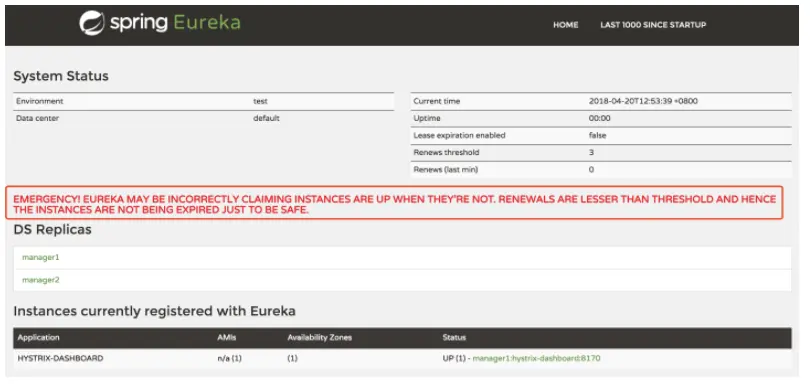 在监控页面上会看到一行红字儿,这些红字儿什么意思呢?代表着Eureka注册中心进入了自我保护机制。