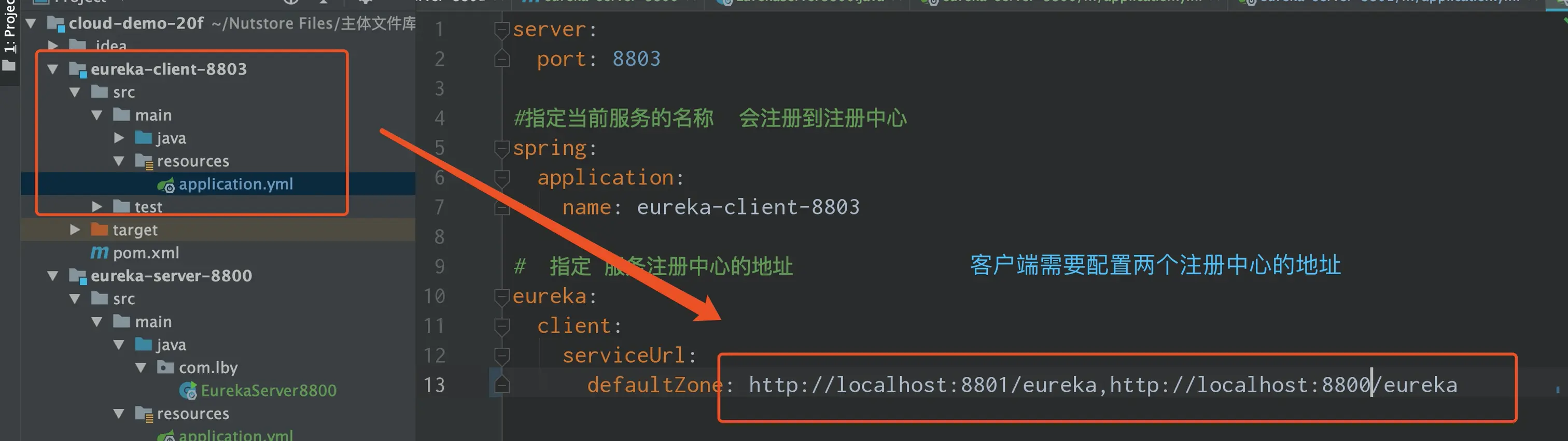 6.修改所有客户端的配置,客户端需要向 注册中心集群注册 所以需要配置所有注册中心的地址