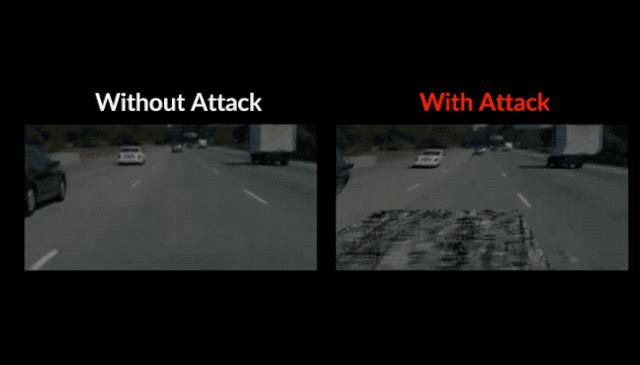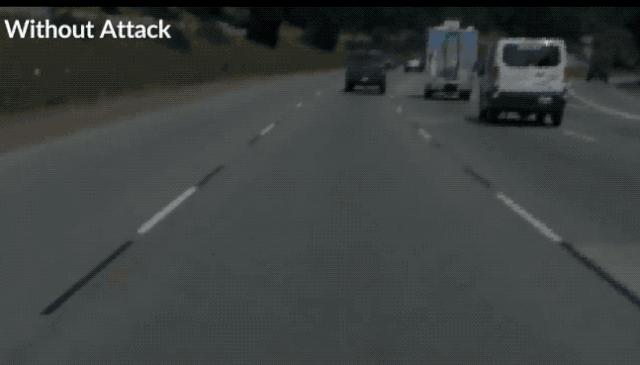 在没有攻击的时候,车辆行进还非常平稳,能保持在自己原有的车道。但经过添加了脏路补丁后,车辆(我们在车里的视角)就像“喝醉了酒”一样,迅速驶出自己的车道。下面是正常情况和添加攻击后的视角对比情况: