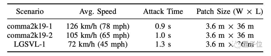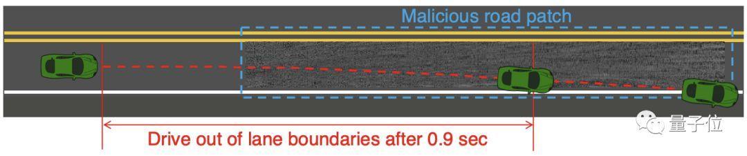 在论文中,他们使用不覆盖车道线的“脏路补丁”作为攻击载体,在最先进的开源车道保持辅助系统OpenPilot上测试:攻击126公里时速的车辆,只需要0.9秒就能让它失控;72公里时速行驶下的汽车,只需要1.3秒。