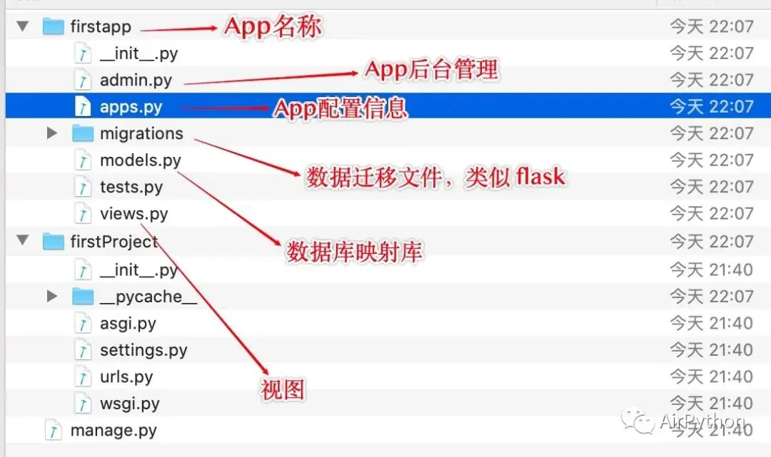python3 manage.py startapp firstapp每一个 App 包含:后台管理功能 admin.py、数据库映射库 models.py、视图文件 views.py、数据迁移文件夹 migrations 等。