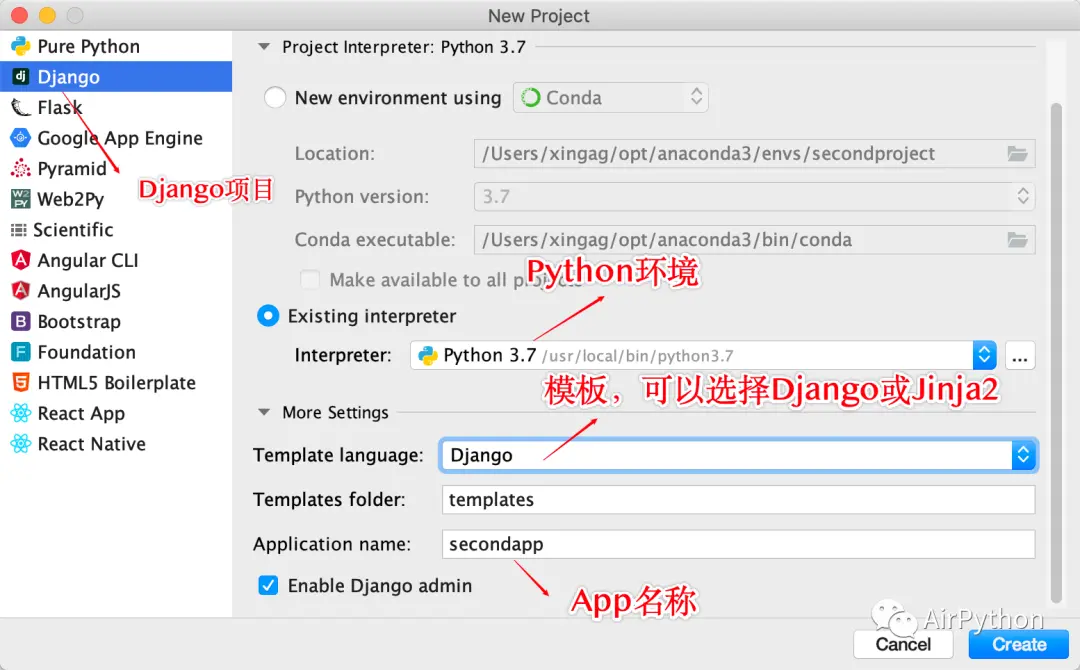 使用 Pycharm 创建、管理项目更加方便,只需要指定项目类型为 Django,选择一个 Python 虚拟环境,设置第一个 App 的名称,即能快速创建一个项目,并内置一个 App