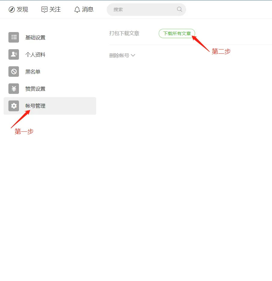 在设置页面先点击左侧的「账号管理」,然后在右边选择「下载所有文章」
