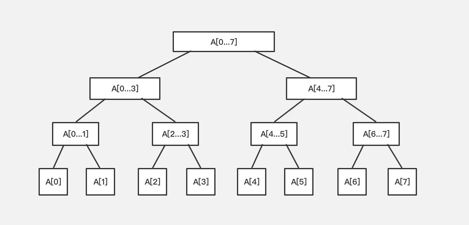 和普通二叉树的区别是,每一个节点所表示的是一个区间内的信息。以求合为例,每一个节点存储的是每个区间相应的数字和,根节点是整个区间的数字和,之后往下分成两个子区间,以此类推,直到最后叶子节点是单个的数字。