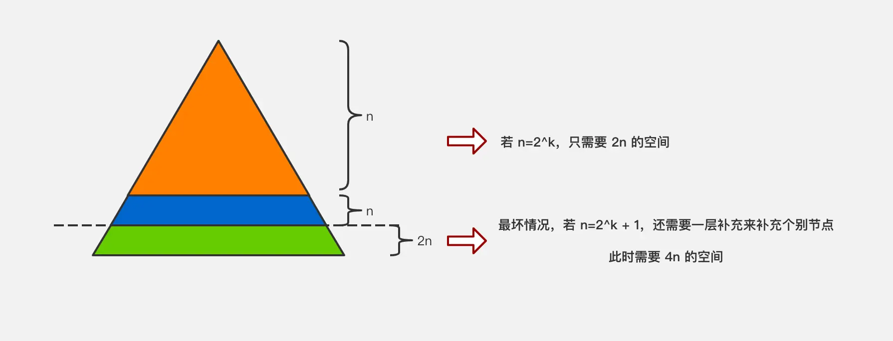 当然 4n 是一个估计值,这 4n 的空间并不是都被占满的,我们留有空余。比如下图的情况,最后一层大部分的节点是 null。