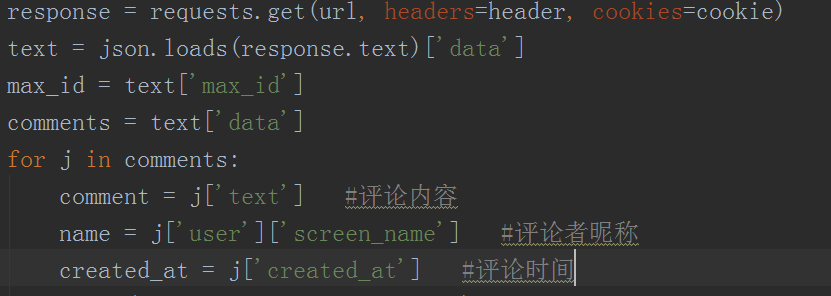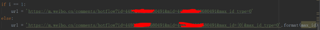 可以看到总共有4个参数,其中第1、2个参数为该条微博的id,就像人的身份证号一样,这个相当于该条微博的“身份证号”,max_id是变换页码的参数,每次都要变化,下次的max_id参数值在本次请求的返回数据中。