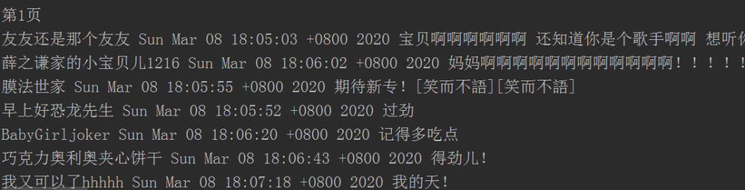 3、然后将返回数据转换成json格式,取出评论内容、评论者昵称和评论时间等数据,输出结果如下图所示。