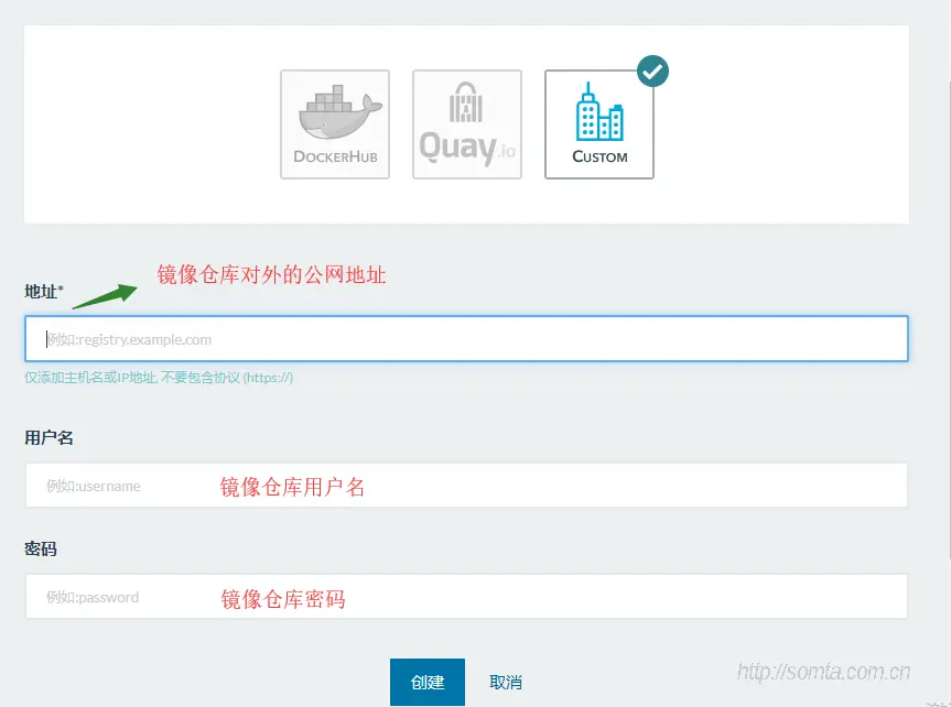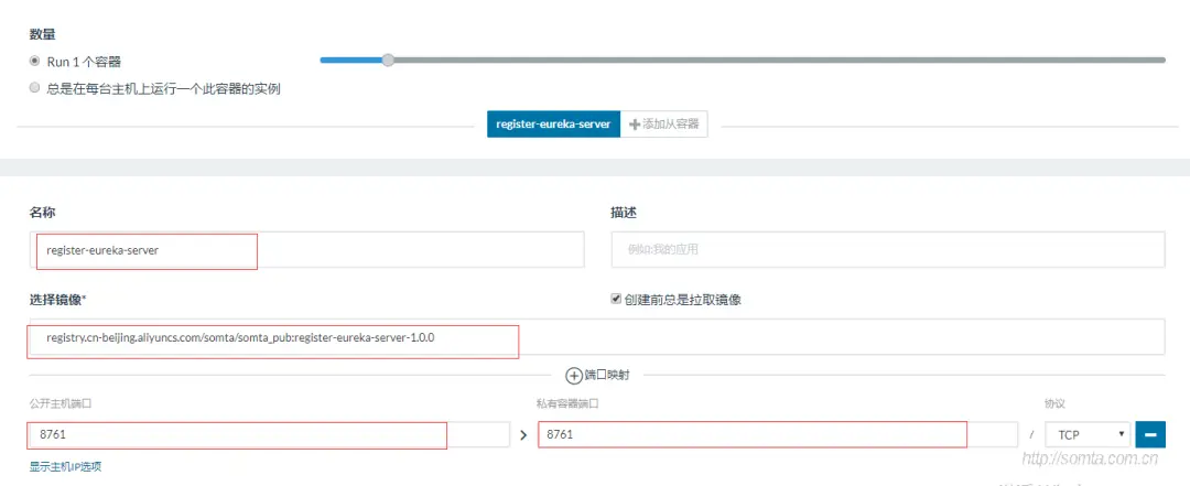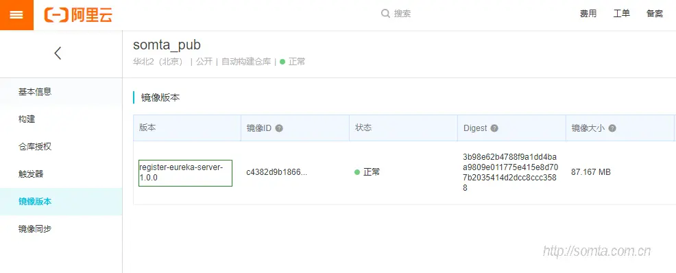 公网地址:镜像版本 例:registry.cn-beijing.aliyuncs.com/somta/somta_pub:register-eureka-server-1.0.0