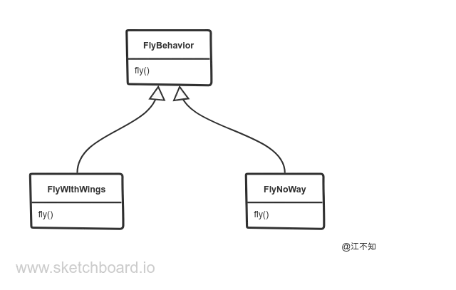 例如,我们的飞行策略名为 FlyBehavior,我们将它设计为一个抽象类(当然也可以是接口)。然后,我们有两种具体的飞行方式 FlyWithWings(会飞)和 FlyNoWay(不会飞),它们需要实现飞行策略中的 fly() 方法: