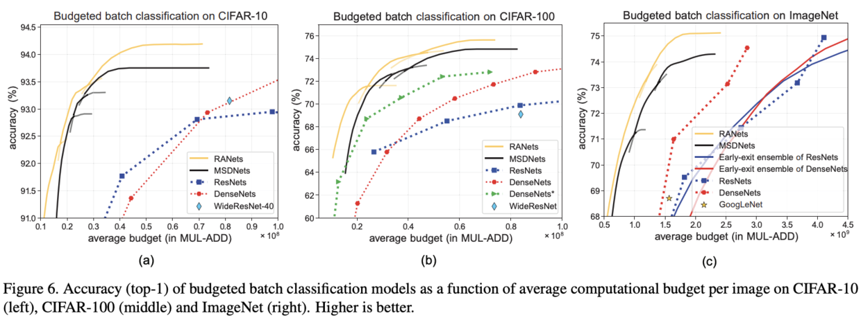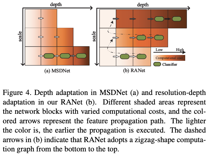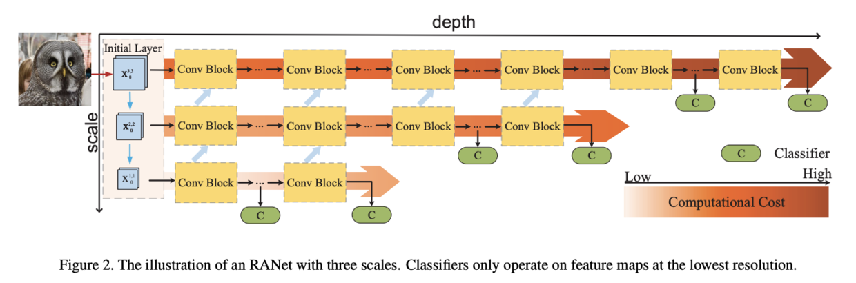 RANet的整体结构和MSDNet十分类似,论文与其进行了对比,MSDNet的分类器放到分辨率最低的路径中,如果中间的分类器没有得到符合预期的结果,则会进行下一步全部尺寸的推理预测。而RANet则是从低尺寸到高尺寸逐步使用不同的子网进行推理预测,这样的方式能更好地自适应结合深度和分辨率。
