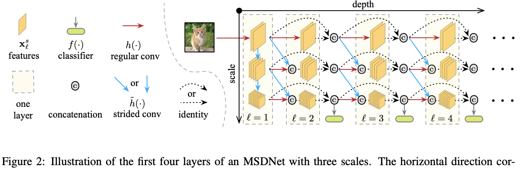 在重复迭代预测的过程中,高分辨率层会融合低分辨率层的特征。尽管RANet已经在初始层对图片进行了从细粒度到粗粒度的处理,子网仍然会继续对其进行下采样,直到特征图大小为 scale(表示初始层产生的最小分辨率),分类器只加在最后几个特征图大小