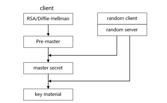 上面术语部分提到了很多密钥,其中客户端随机数、服务端随机数的产生较为简单,但premaster secret、master secret、session key的产生比较复杂。 整个SSL/TLS中密钥产生流程: