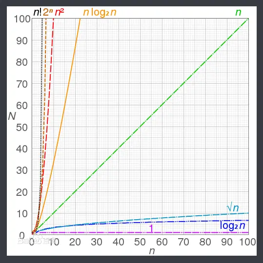 关于各个时间复杂度的比较有下图所示: