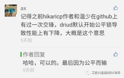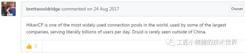 不评论,一个追求性能,一个偏向监控,直接看之前有人给HikariCP提的关于跟Druid对比分析的issue吧。HikariCP作者对Druid做了测试并给出了测试结果数据,Druid作者温少也对此作了评论。Issue链接: