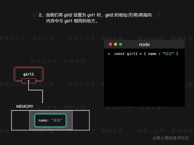 2、当我们将 girl2 设置为 girl1 时,girl2 的地址(引用)将指向内存中与 girl1 相同的地方。
