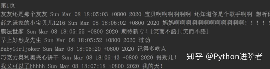 3、然后将返回数据转换成json格式,取出评论内容、评论者昵称和评论时间等数据,输出结果如下图所示。