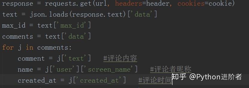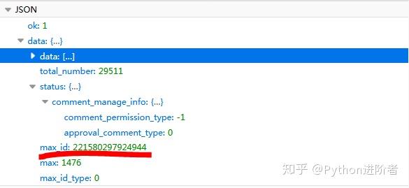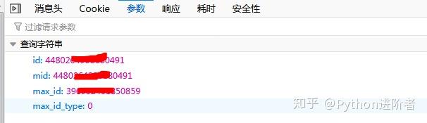 可以看到总共有4个参数,其中第1、2个参数为该条微博的id,就像人的身份证号一样,这个相当于该条微博的“身份证号”,max_id是变换页码的参数,每次都要变化,下次的max_id参数值在本次请求的返回数据中。
