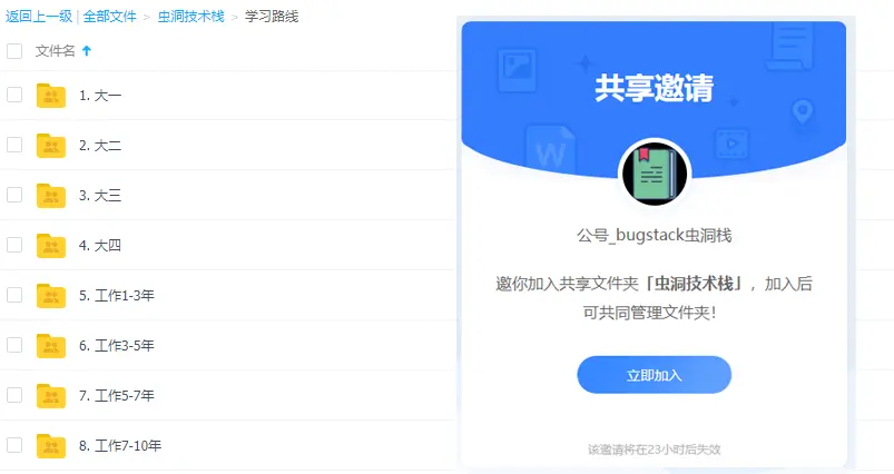 以下是我对大学四年和工作5年左右的一个学习路线整理,并将所有资料按照大一、大二...到工作五年,分别汇总到网盘里,以便不至于将资料弄到一堆,根本没法看。因为分享链接总是失效,可以通过关注公众号:bugstack虫洞栈,回复:学习资源下载+百度帐号,获取加入链接,下载有序分类的300G资料。