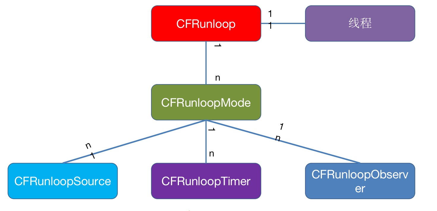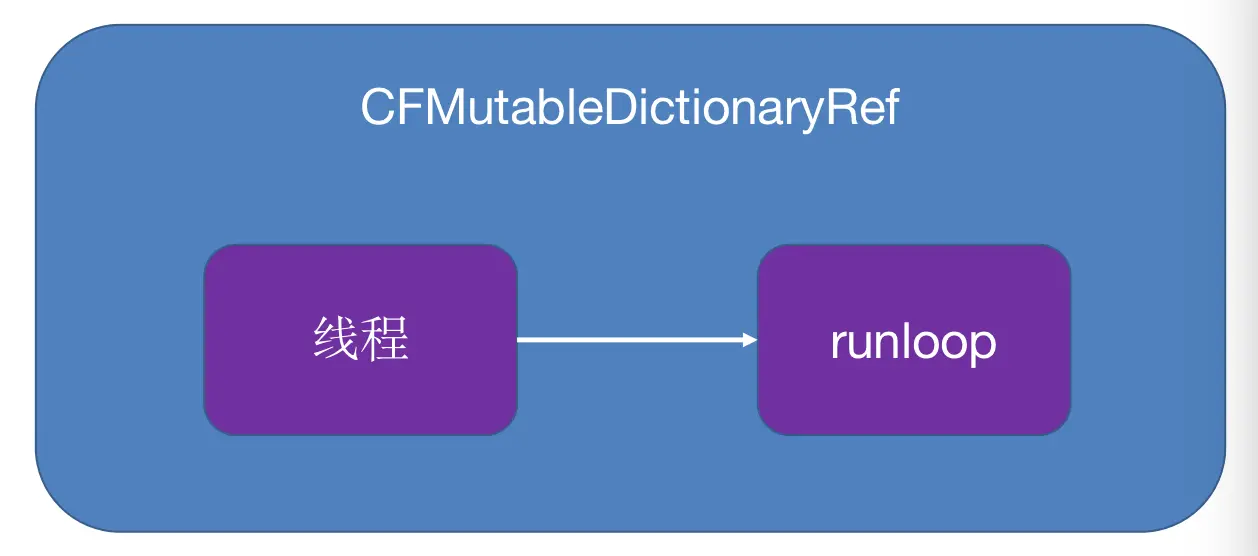 __CFRunLoops,线程为key,对应的runloop为value保存在__CFRunLoops,线程和runloop是一一对应的关系.