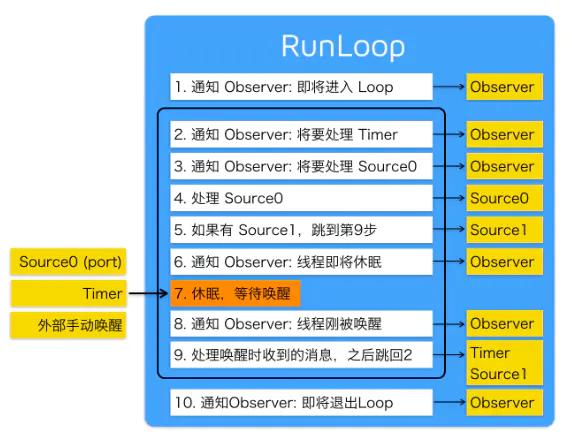 - 9、处理未处理的事件。 如果用户定义的定时器启动,处理定时器事件并重启RunLoop。进入步骤2。 如果输入源启动,传递相应的消息。 如果RunLoop被显示唤醒而且时间还没超时,重启RunLoop。进入步骤2